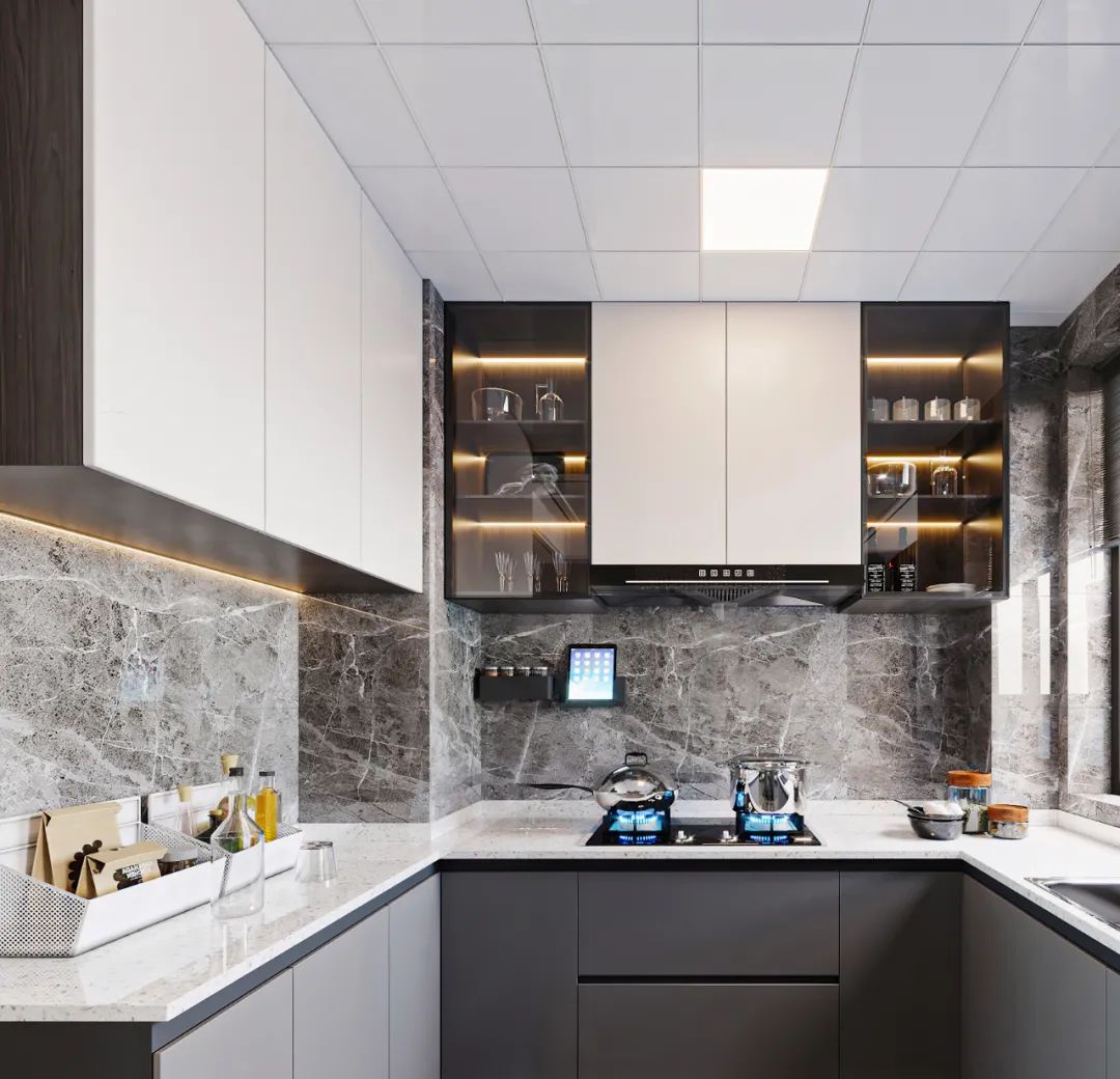 和玄关柜一样,时间长久,顶部容易积灰几乎是无法清理的,而且厨房是重油烟的地方,顶部也会吸附油烟,更难清理。因此做到顶既能保证美观和颜值,也避免了打扫清理的麻烦。